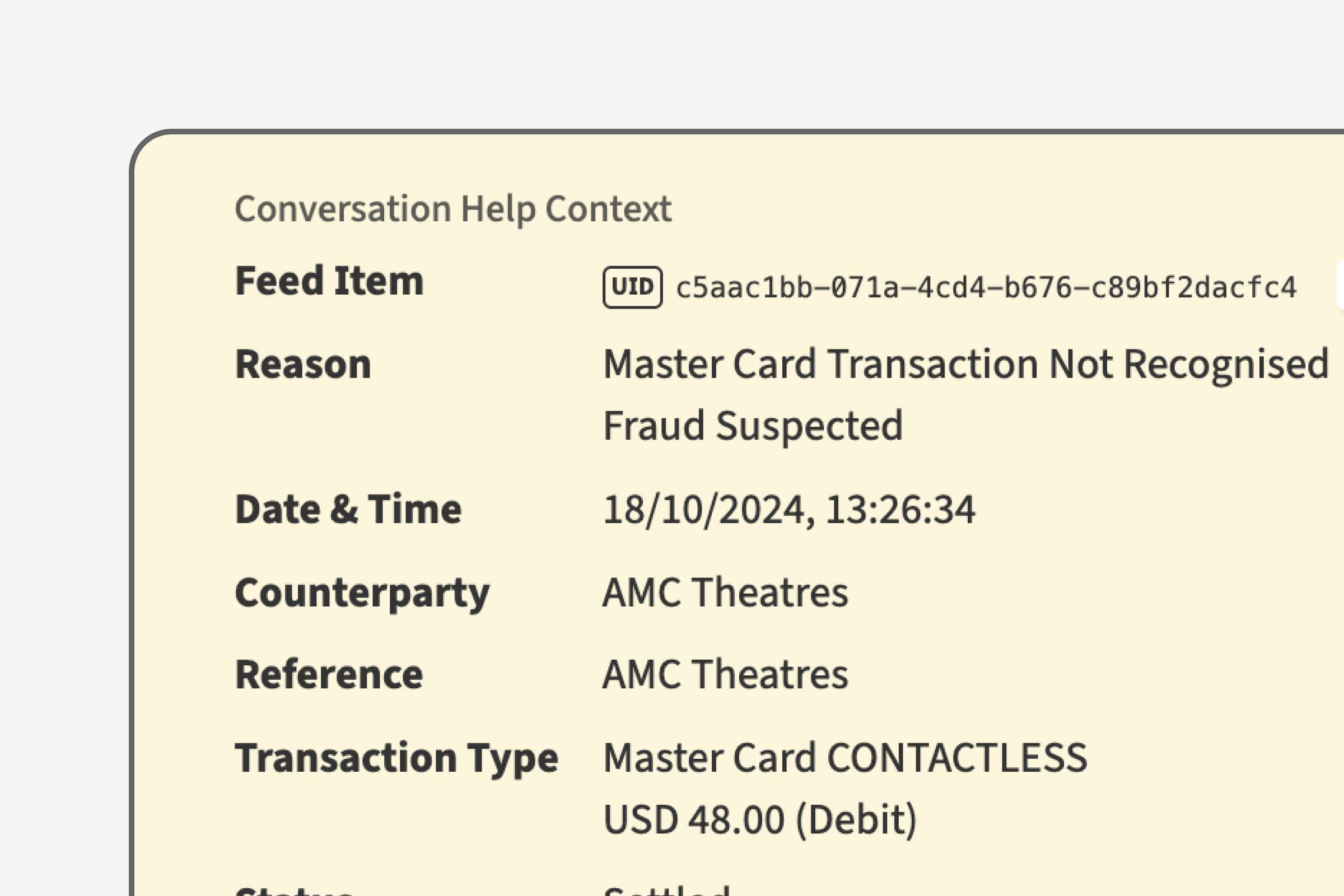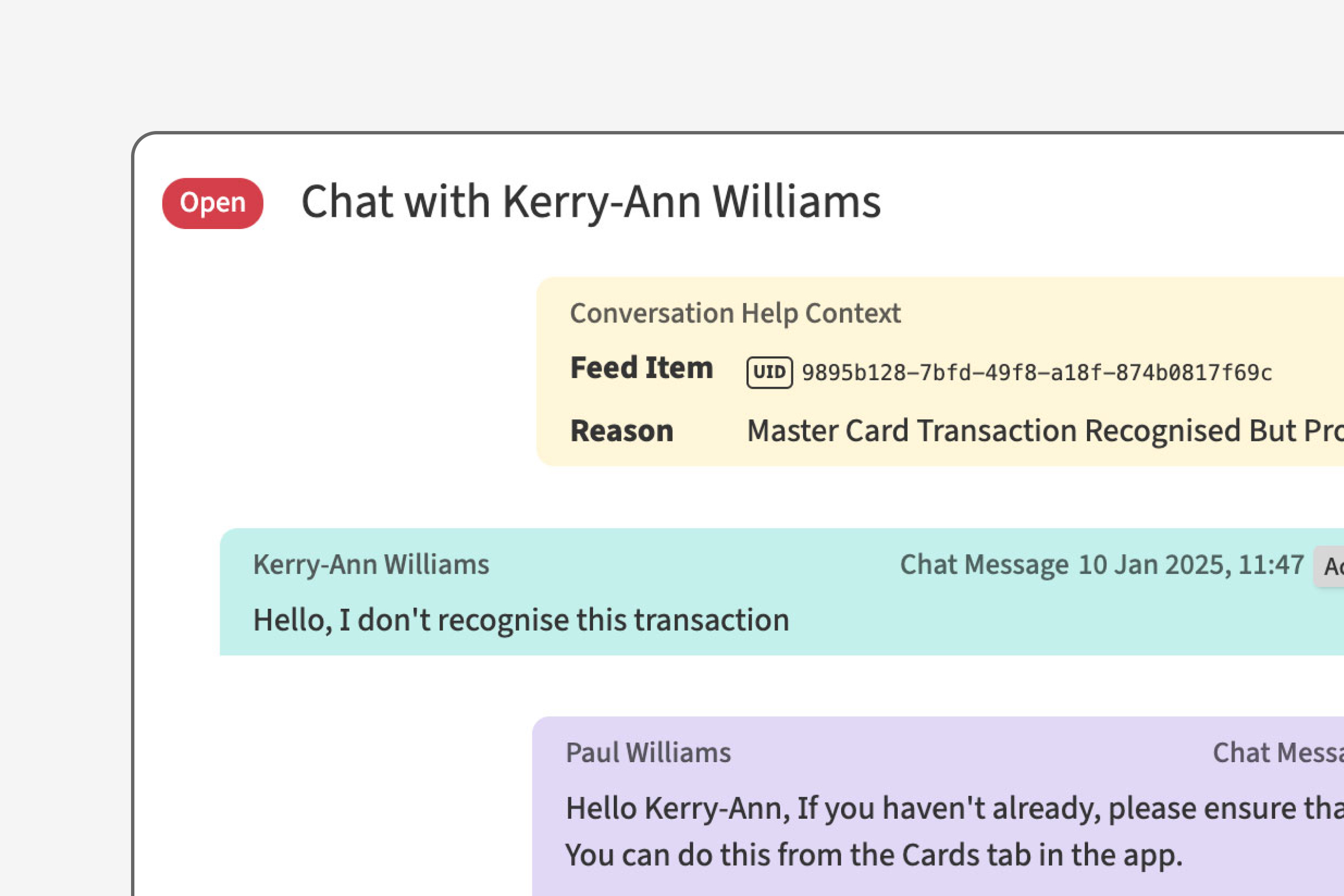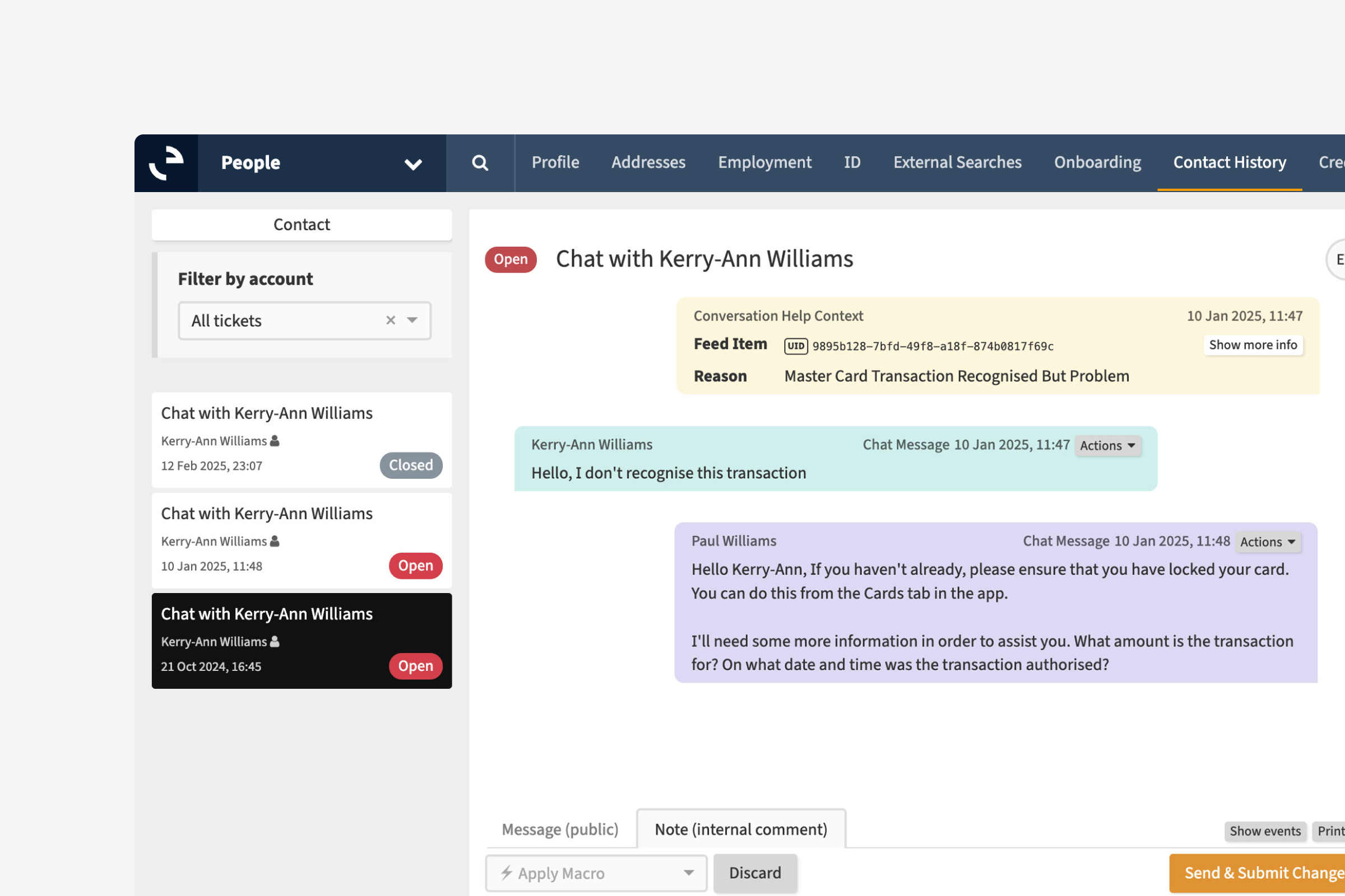 Rapidly address and solve issues relating to fraud, lost cards and other disputes. Customers speak to one customer service agent throughout their whole interaction, minimising friction and ensuring issues are resolved as quickly as possible, leveraging the original onboarding decision and documentation to keep accounts secure.